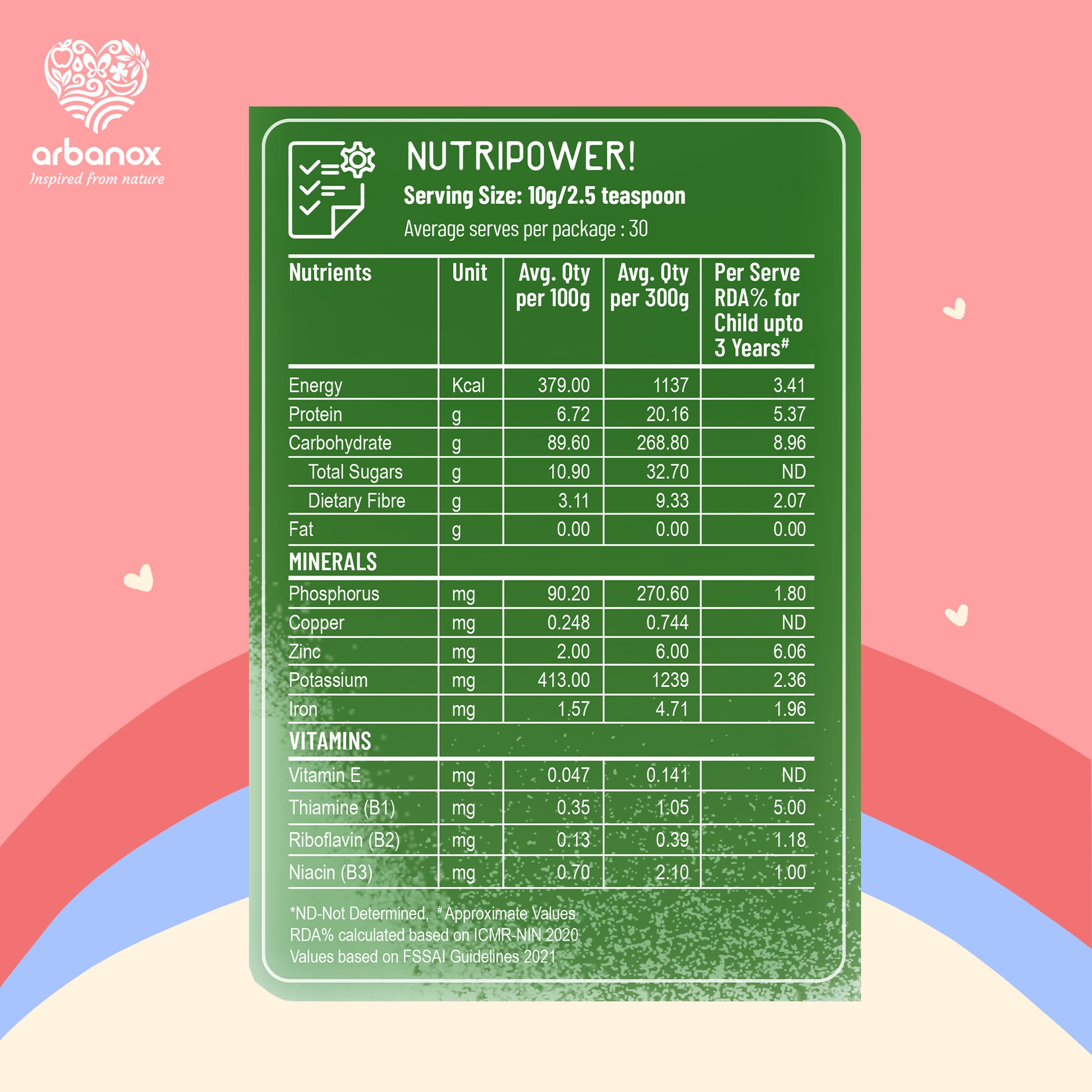 Made from carefully chosen components, BabyVita’s Rice Banana Powder provides a simple method to start your child’s diet with solid foods. It is a delightful and nourishing combination of rice flour and dried Nendran banana that is ideal for starting solid foods for your baby. The rice banana powder mix is curated to provide the vital nutrients required for your little one’s growth and development, enriched with a significant amount of rice-based carbs, providing all-day energy.