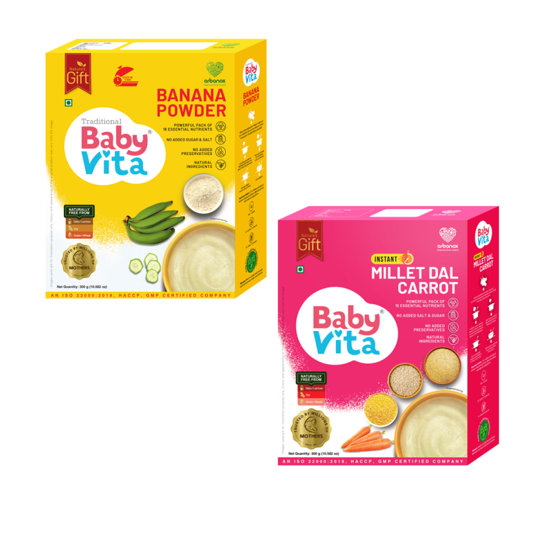 BabyVita Banana Powder & Millet Dal Carrot Mix Combo | Nutrient-Rich, No Added Sugar, Salt, Flavors, Preservatives | Trusted by Mothers | For Weaning Stage | Pack of 2 - 300g Each